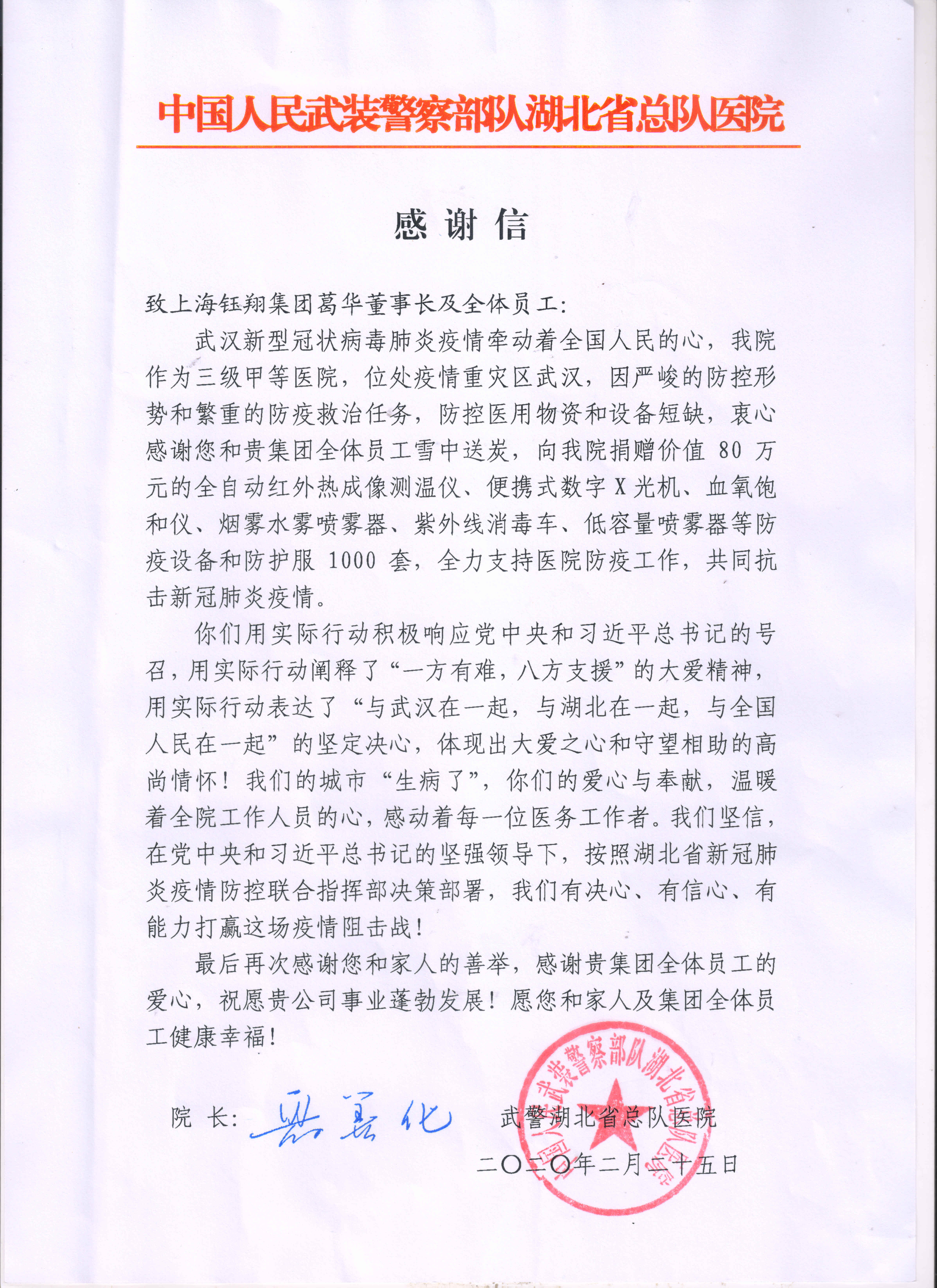 在收到此批捐贈物資后,武警湖北省總隊(duì)醫(yī)院第一時間向鈺翔控股集團(tuán)發(fā)來了感謝信。