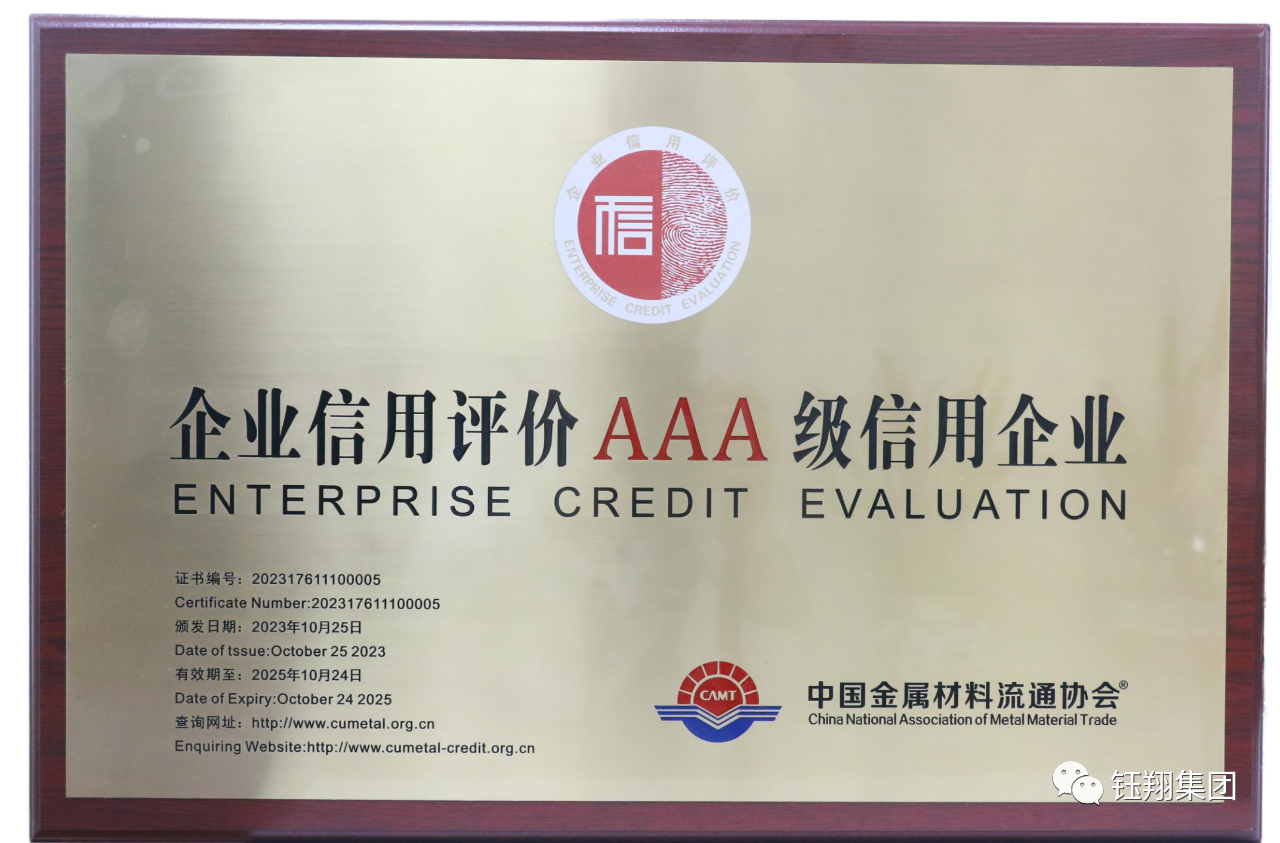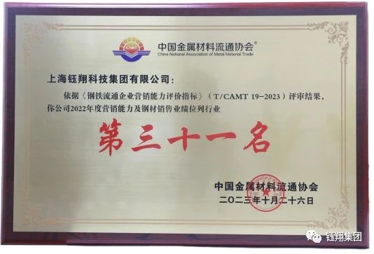 10月25日至26日,由中國金屬材料流通協會、鄭州市金水區人民政府、河南中鋼網科技集團股份有限公司聯合主辦的第十八屆中國鋼鐵流通促進大會,在鄭州市隆重舉行。大會上,上海鈺翔科技集團有限公司榮獲“2022年度營銷能力及鋼材銷售五十強企業第31名”,以表彰其在促進鋼鐵貿易發展中做出的突出貢獻。同時,榮獲鋼鐵行業至高榮譽與實力象征的企業信用評價AAA級信用企業”